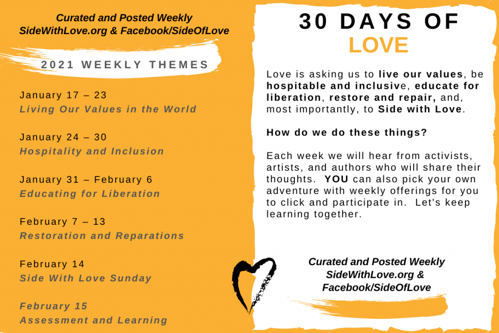 30 Days of Love 2023! Side with Love’s annual month of spiritual nourishment, political grounding, and shared practices of faith and justice, 30 Days of Love will go from Martin Luther King, Jr. Day (January 16) through Valentine’s Day (February 14). This year’s 30 Days of Love is a love letter to our whole beloved community – families, religious professionals, partners and communities that embody our values and work for justice and liberation year round. Each week will feature a spiritual theme overlapping with one of Side With Love’s intersectional justice priorities, and we’ll share an array of offerings to help nourish your spirit and give gratitude and affirmation. Learn More Here