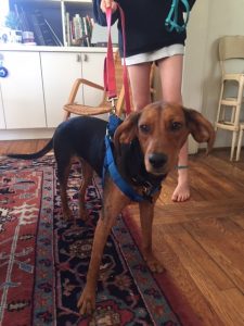 Slinky came to live with us on Tuesday, via Brother Wolf and a foster family. She is a 22-pound, seven-month-old hound mix who is still learning not to eliminate in the house. She is sweet, energetic (goes without saying) and eager to please.