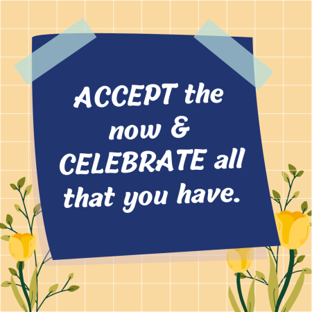 Somewhere along the way, I had learned of positive affirmations that were not only positively framed but believable and possible. I shaped one for myself: “ACCEPT the now & CELEBRATE all that you have.” Slips of paper with these words appeared on my computer, bathroom mirror, bedside lampshade, and elsewhere. Whenever I got the woe-is-me/s, I’d stop and think of something to be grateful for in that moment.