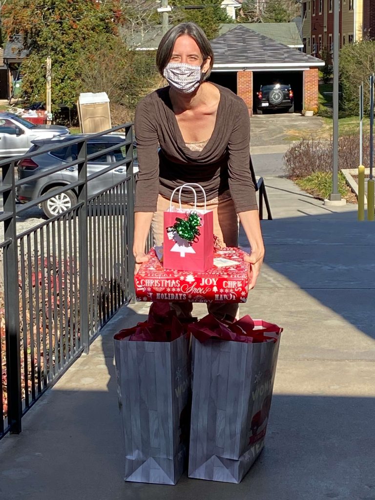 Laurel Stolte picking up gifts at UUCA.