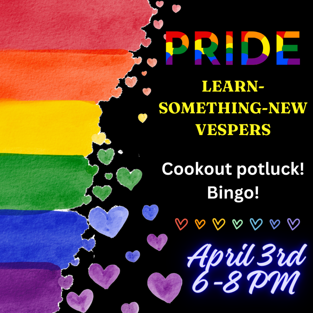 Join the Pride+ Team and Rev. Audette for this Very Special Vespers evening! We’ll have a potluck/cookout – bring a dish to share and we’ll have veggie and real hot dogs & chips available. During dinner, we’ll have conversation and reflection, and then we have a fun night of LEARN-SOMETHING-NEW Bingo (complete with prizes!). What is genderism? Are you apresromantic? How about ceteroromantic? Join us for this fun evening and learn something new with the Pride + team! Please RSVP here.